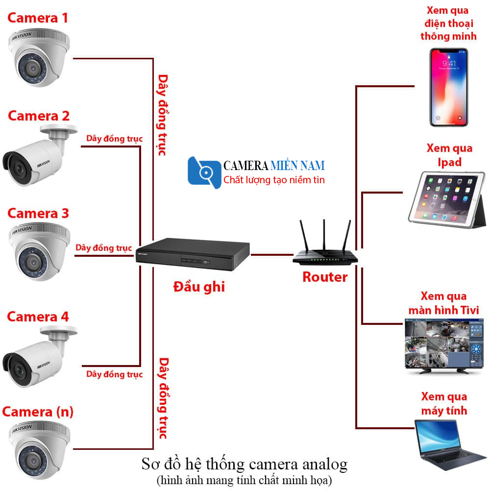 Hệ thống camera quan sátgồm có Đầu ghi hình, Camera, Dây dẫn kết nối các camera tới đầu ghi (Đối với camera Analog và camera AHD (Tìm hiểu thêm về camera AHD) sử dụng dây dẫn là dây cáp đồng trục. Còn camera IP (Tìm hiểu về camera IP) dùng cáp mạng UTP).